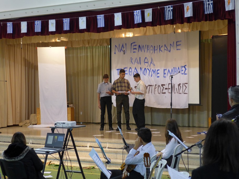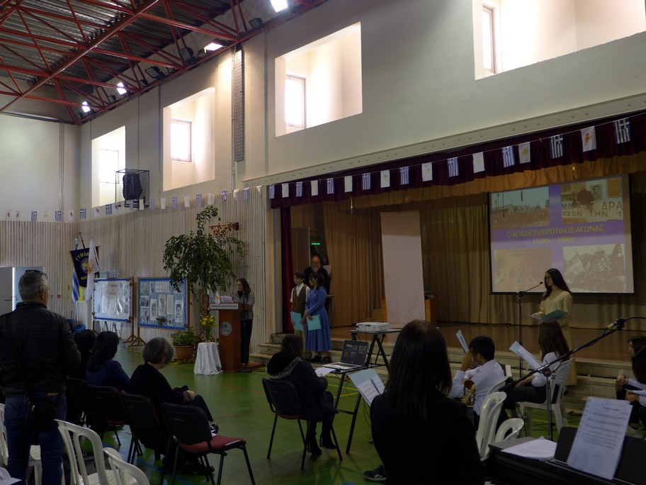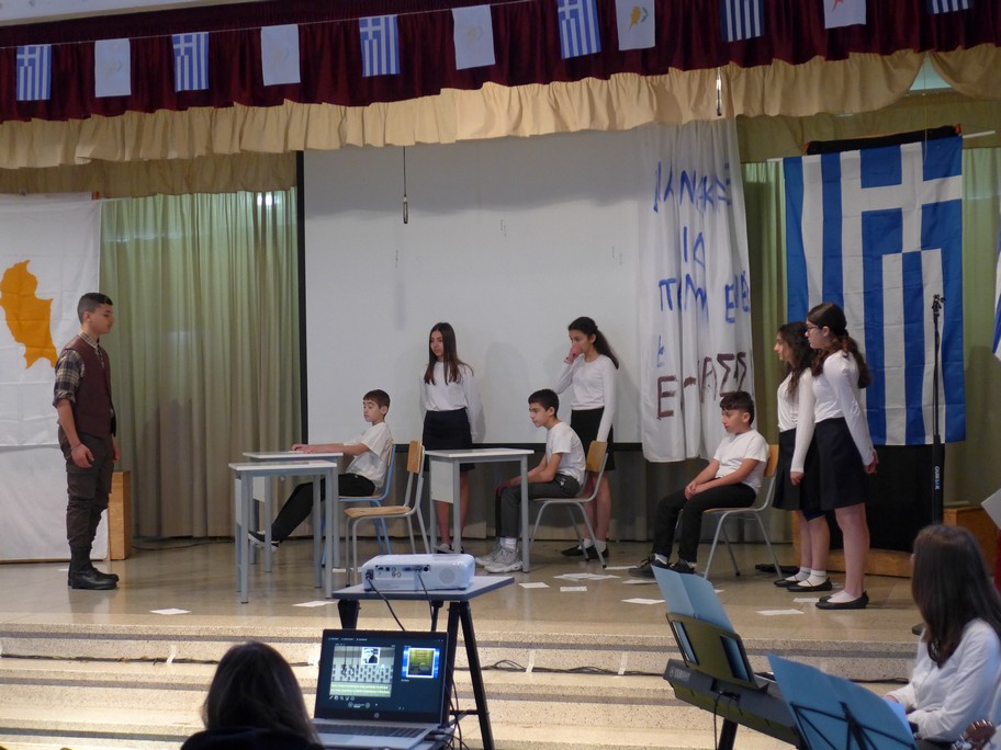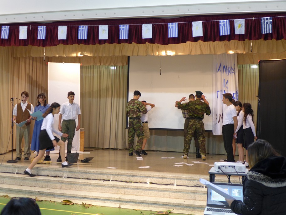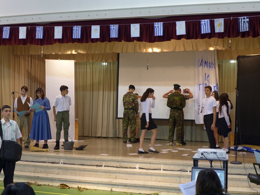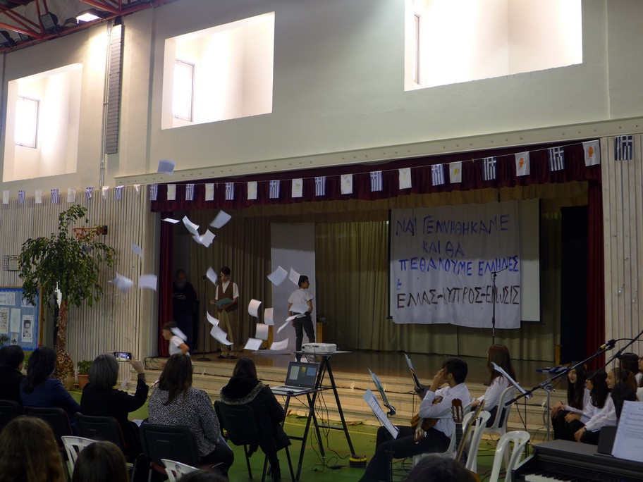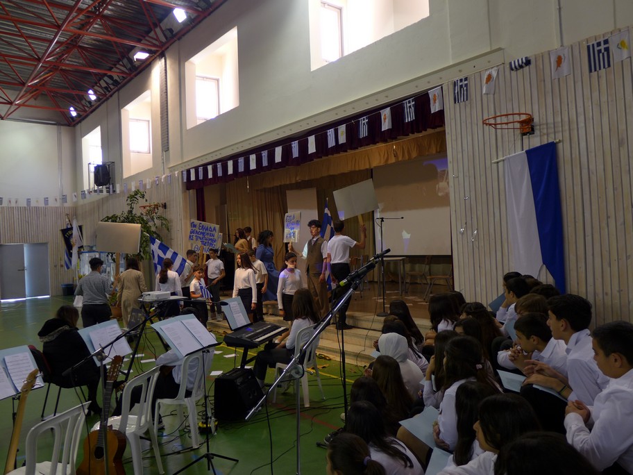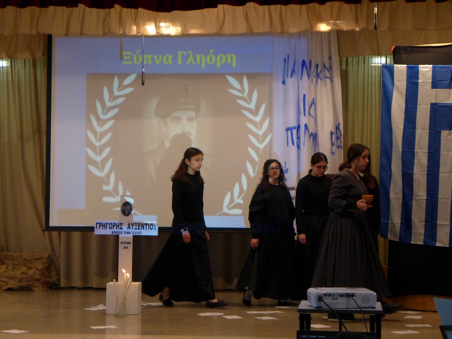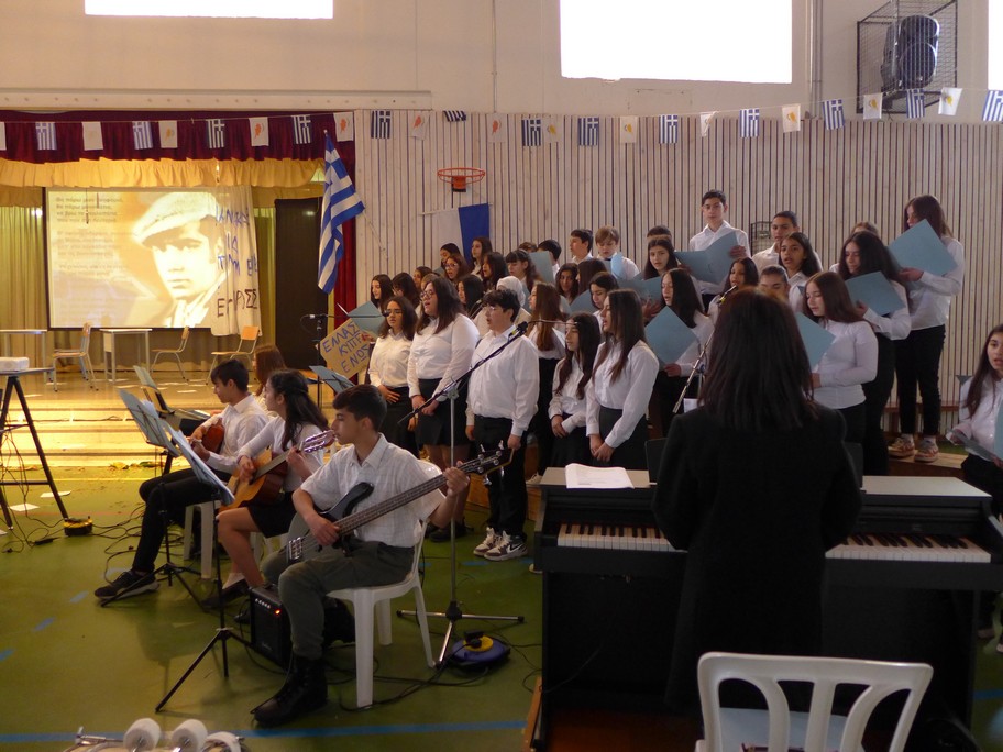 Εορτασμός για την εκδήλωση της 1ης Απριλίου. Οι μαθητές/τριες παρακολούθησαν εκδήλωση κατά την 3η και 4η περίοδο που ετοιμάστηκε από τη φιλόλογο του σχολείου κα Γιώτα Μνάσωνος και την κα Λιάνα Κουπεπίδου, καθηγήτρια Φυσικής Αγωγής. Στην εκδήλωση παρουσιάστηκαν ποιήματα και πεζά, δρώμενα, χοροί και τραγούδια από τη χορωδία του σχολείου μας.