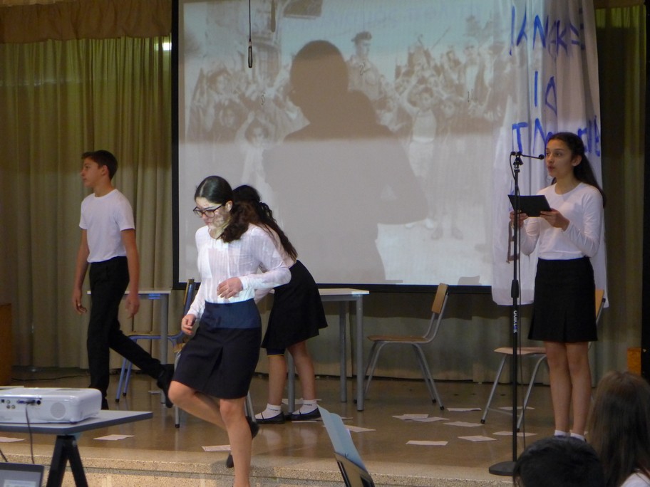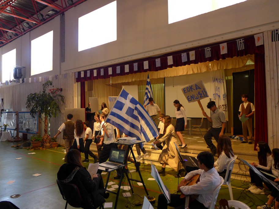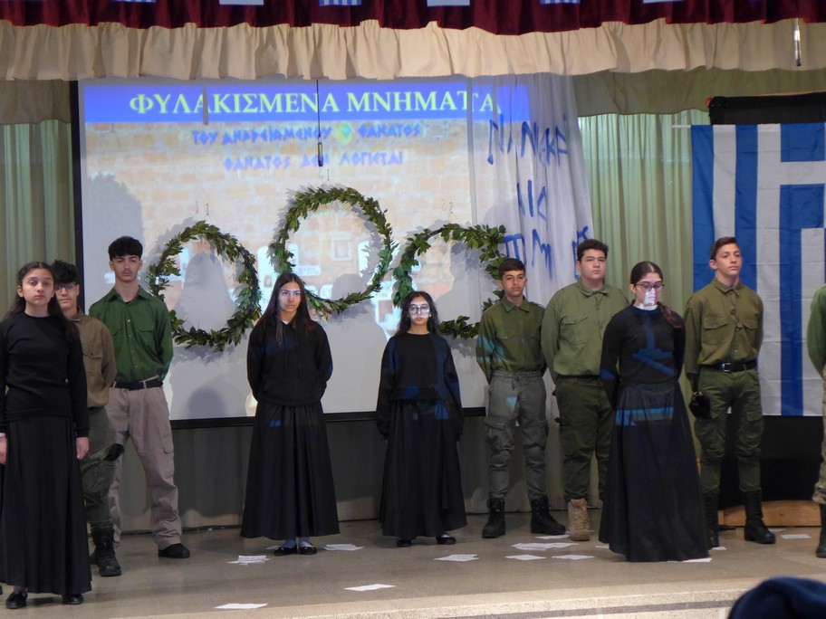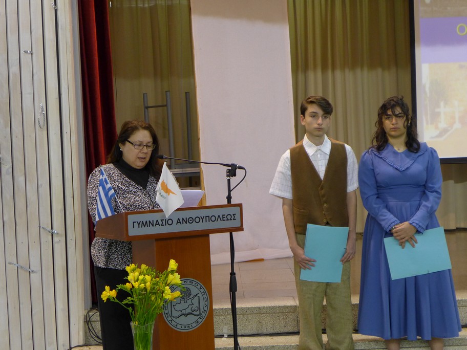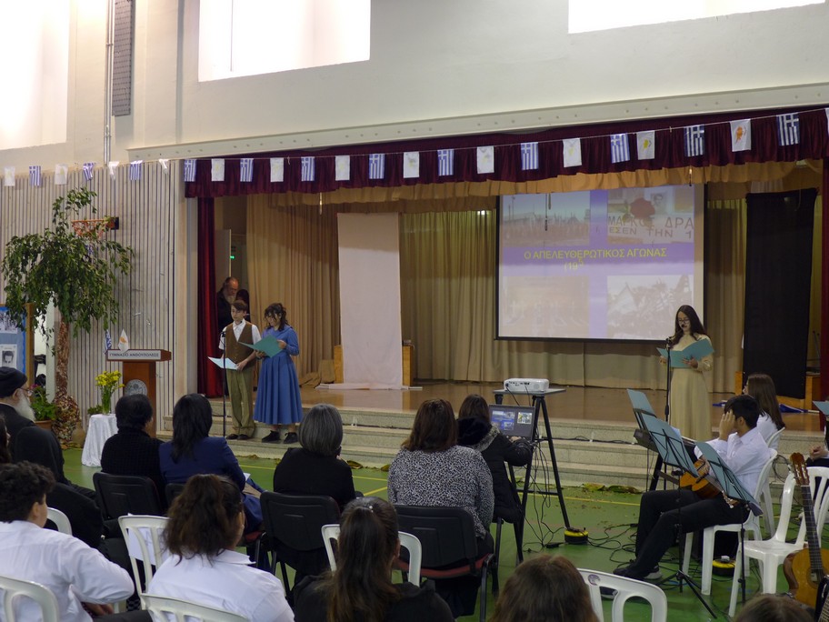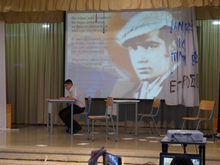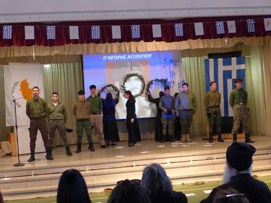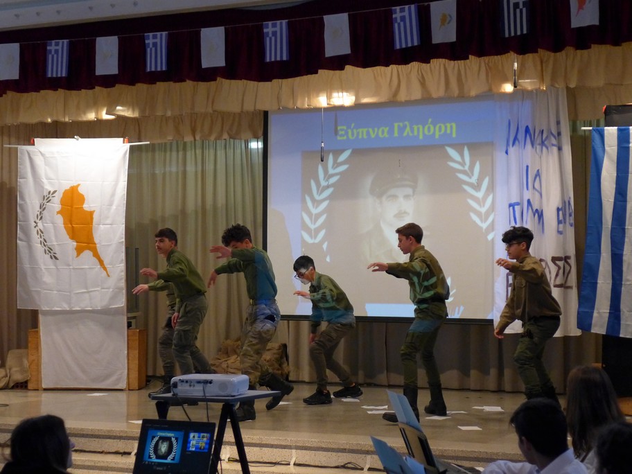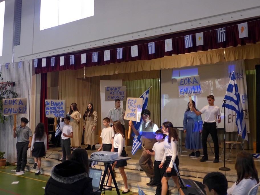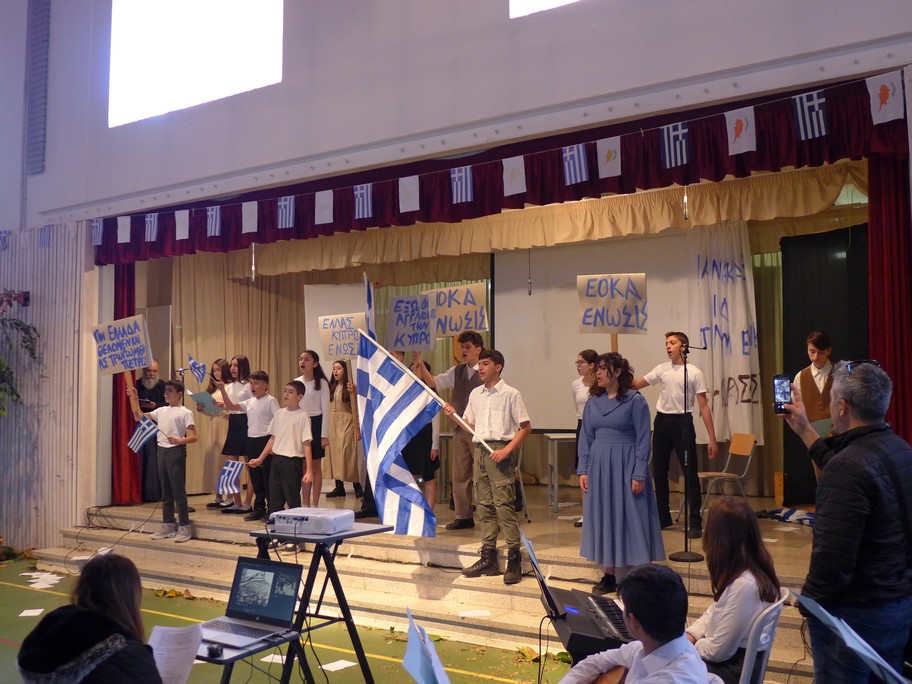 Εορτασμός για την εκδήλωση της 1ης Απριλίου. Οι μαθητές/τριες παρακολούθησαν εκδήλωση κατά την 3η και 4η περίοδο που ετοιμάστηκε από τη φιλόλογο του σχολείου κα Γιώτα Μνάσωνος και την κα Λιάνα Κουπεπίδου, καθηγήτρια Φυσικής Αγωγής. Στην εκδήλωση παρουσιάστηκαν ποιήματα και πεζά, δρώμενα, χοροί και τραγούδια από τη χορωδία του σχολείου μας.