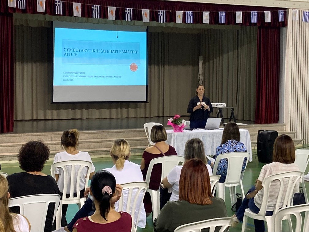 Στη συνέχεια, η Σύμβουλος του Σχολείου κ. Ειρήνη Χρυσοστόμου, ανέπτυξε στους παρευρισκόμενους τον ρόλο του/της Συμβούλου στη Μέση Γενική Εκπαίδευση.